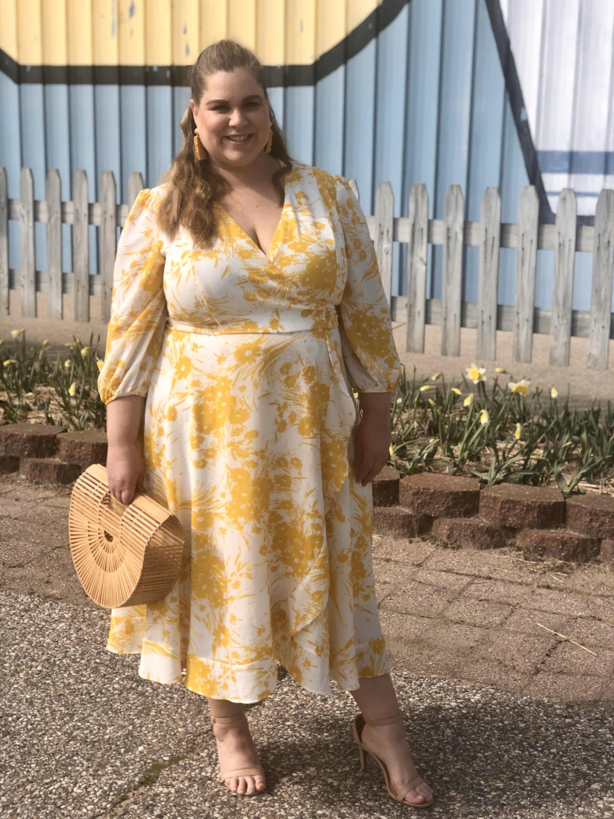 This last look is for someone who might not be the biggest fan of yellow but likes a little bit of yellow in a pattern! I’ve got you all covered! This dress is one of my favorite silhouettes! I love the wrap look and all of the colors! This dress just gives me a glimpse of all of the beautiful flowers to come this spring! I paired it with the same nude sandals and yellow earrings and I love this look!