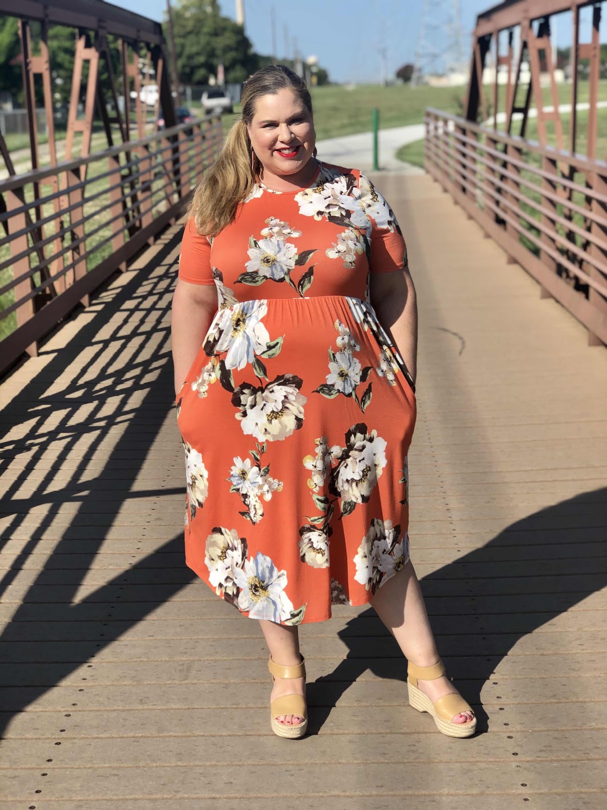 Let’s get started with this fun orange floral dress! This dress is perfect for our weather now since it’s warmer but I can also throw on a denim jacket when it cools down. Booties are a perfect addition for this dress or you can even wear sandals with it too until it gets cooler! The best part of this dress is the style of it which is so classic and it looks great on everyone. Oh and it has pockets too!