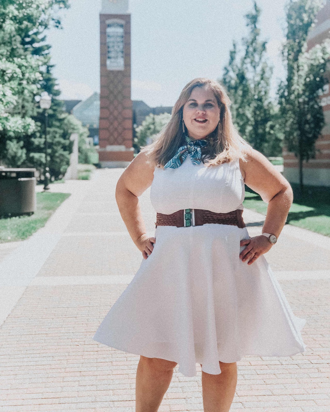 I’ve been loving working with Jessica London over the past few months and I loved this white dress that I picked out! It comes with a self fabric belt but I chose to belt it with a tan and turquoise belt and accessorize with a scarf and pink shoes. It’s longer in the back than in the front so I love the extra depth of this dress when twirling!